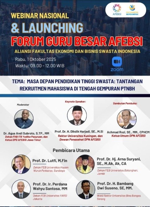UNIBADAILY.ID, Serang – AFEBSI (Aliansi Fakultas Ekonomi dan Bisnis Swasta Indonesia) menggelar Webinar Nasional sekaligus Launching Guru Besar AFEBSI Nasional. Acara Diselenggarakan melalui Zoom Meeting dihadiri oleh dekan, rektor, dan dosen dari berbagai kampus swasta di Indonesia hadir dalam satu forum, Rabu (1/10/2025).