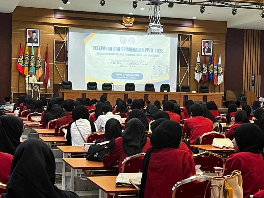 UNIBADAILY.ID, Serang — Fakultas Keguruan dan Ilmu Pendidikan (FKIP) Universitas Bina Bangsa (UNIBA) secara resmi menyelenggarakan Pelepasan dan Pembekalan Lapangan Kependidikan (PPLK) Tahun 2026 kurang lebih 1.000 mahasiswa yang berlangsung di Auditorium UNIBA lantai 6 gedung D, pada hari Sabtu, (24/01/2026).